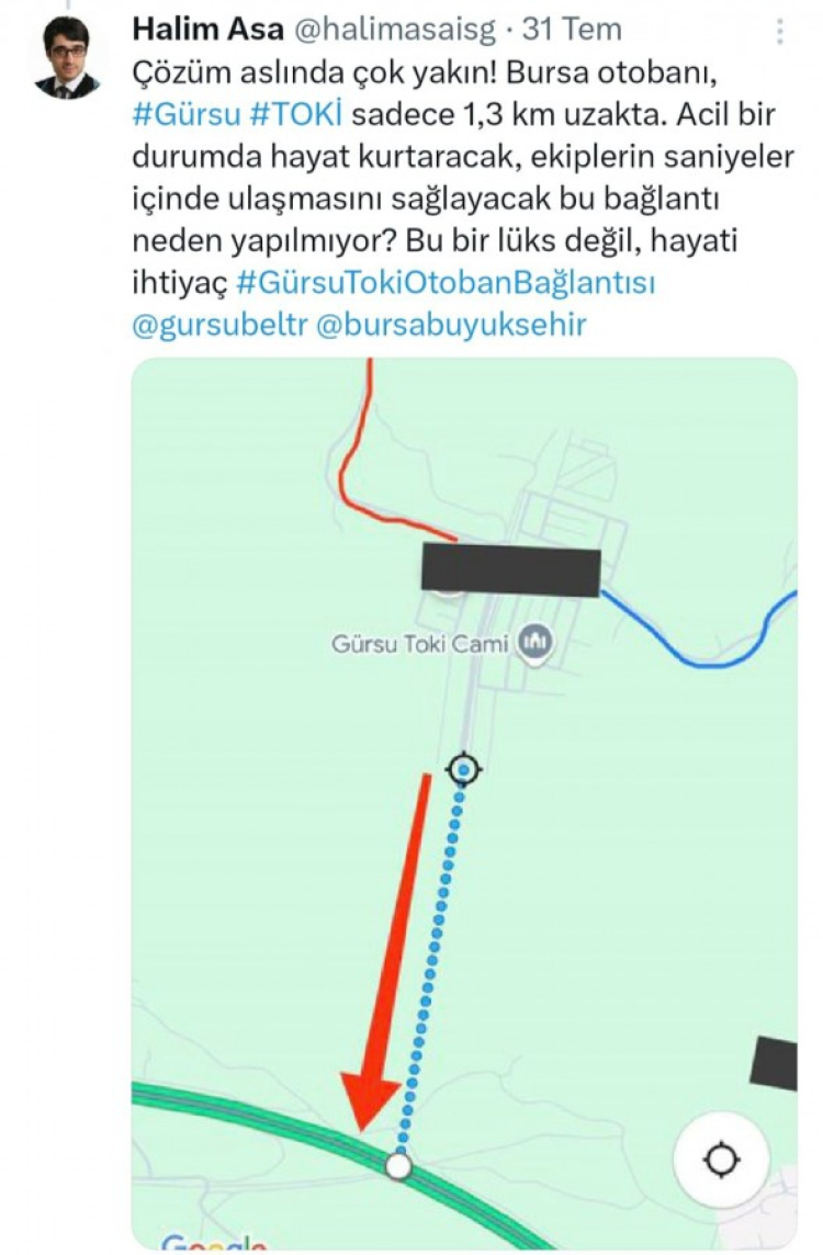 Bursa otobanının Gürsu TOKİ'ye sadece 1,3 kilometre mesafede bulunduğunu söyleyen Asa, "Acil bir durumda hayat kurtaracak, ekiplerin saniyeler içinde ulaşmasını sağlayacak bu bağlantı neden yapılmıyor? Bu bir lüks değil, hayati ihtiyaç" dedi.