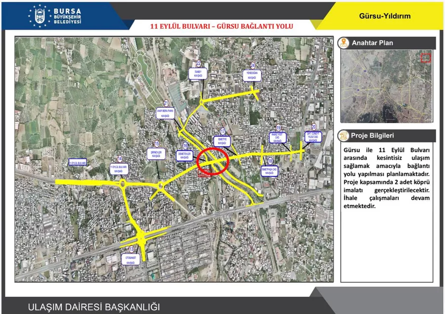 Bursa'da ulaşımı rahatlatacak önemli bir proje daha hayata geçiyor. Bursa Büyükşehir Belediyesi tarafından planlanan çalışma kapsamında, Gürsu ile 11 Eylül Bulvarı arasında kesintisiz ulaşım sağlayacak yeni bir bağlantı yolu inşa edilecek.