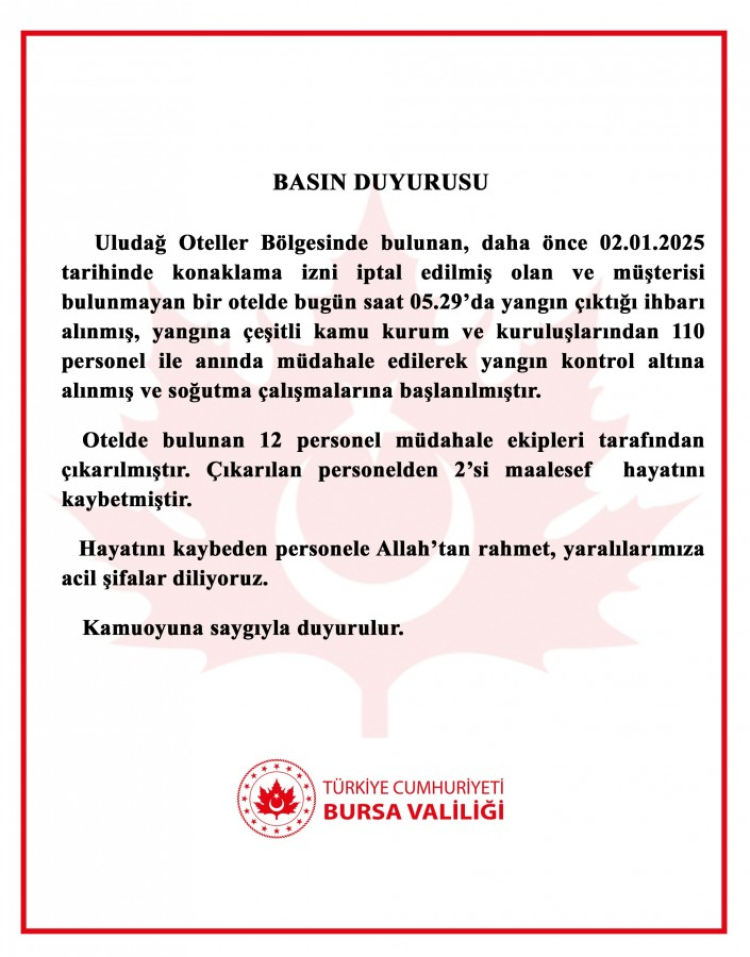 Bursa Valiliği, Uludağ Oteller Bölgesinde meydana gelen yangına ilişkin basın duyurusu yayınladı.