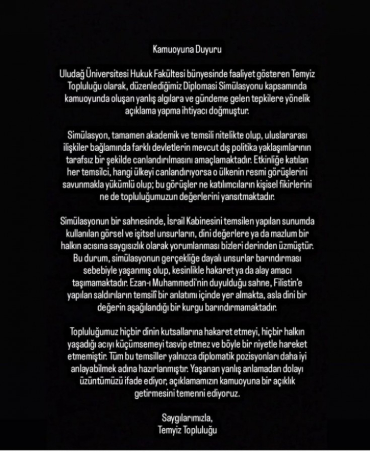 Uludağ Üniversitesi'nde düzenlenen Diplomasi Simülasyonu etkinliği tartışmalara neden oldu. Sosyal medyaya yansıyan görüntülerde Filistin ve ezana yönelik saygısızlık yapıldığı iddiaları sonrası Temyiz Topluluğu'ndan ve üniversite yönetiminden açıklama geldi.