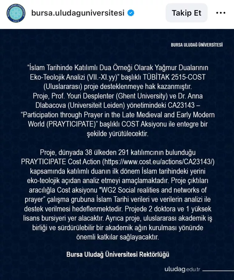 Bursa Uludağ Üniversitesi, sosyal medyada tartışma konusu olan "İslam tarihinde katılımlı dua örneği olarak yağmur dualarının eko-teolojik analizi" başlıklı projeye ilişkin açıklama yaptı. Üniversite, projenin uluslararası akademik değerlendirme süreçlerinden geçtiğini vurgulayarak eleştirileri kabul etmediklerini duyurdu.