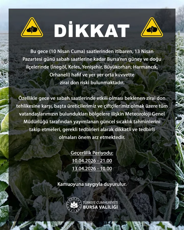 Bu gece (10 Nisan Cuma) saatlerinden itibaren, 13 Nisan Pazartesi günü sabah saatlerine kadar Bursa'nın güney ve doğu ilçelerinde (İnegöl, Keles, Yenişehir, Büyükorhan, Harmancık, Orhaneli) hafif ve yer yer orta kuvvette zirai don riski bulunmaktadır.