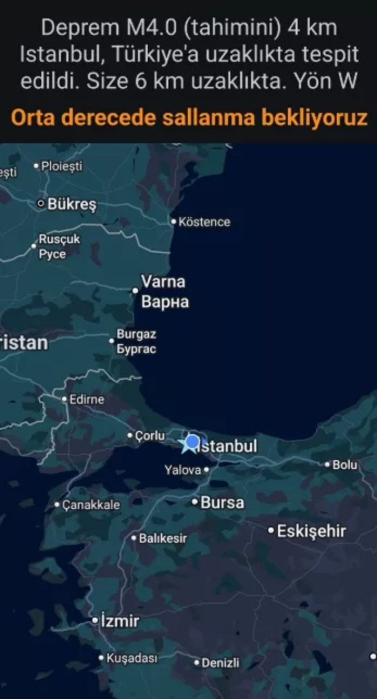 İstanbul'da deprem olduğunu ifade eden kullanıcılar cep telefonlarına gelen deprem bildirimlerini paylaştı. Ekran görüntülerinde depremin büyüklüğünün 4 olduğu görüldü.