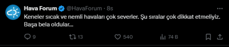 Hava Forum sosyal medyadan yaptığı paylaşımda kene uyarısı geçti. Paylaşım şu şekilde;