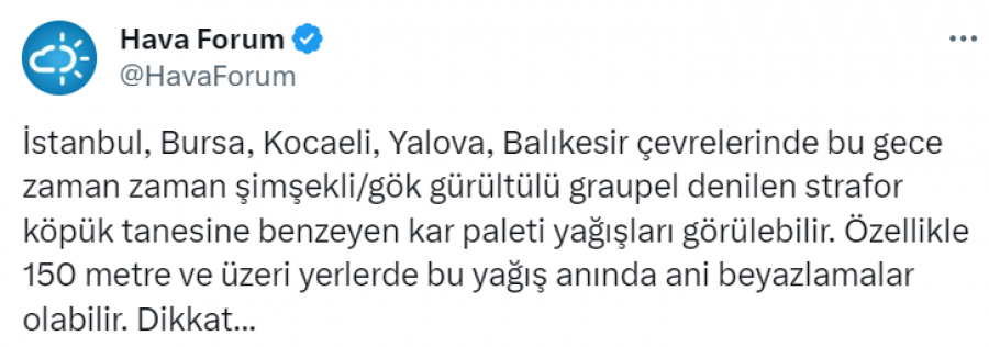 Hava Forum'dan yapılan paylaşım şu şekilde; "İstanbul, Bursa, Kocaeli, Yalova, Balıkesir çevrelerinde bu gece zaman zaman şimşekli/gök gürültülü graupel denilen strafor köpük tanesine benzeyen kar paleti yağışları görülebilir. Özellikle 150 metre ve üzeri yerlerde bu yağış anında ani beyazlamalar olabilir. Dikkat..."