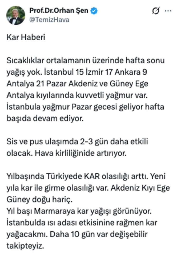 Meteoroloji Uzmanı Orhan Şen sosyal medya hesabından kar yağışı ile ilgili açıklamalarda bulundu. Şen, yaptığı paylaşımda "Yılbaşı Marmara'da kar yağışı görünüyor" ifadelerini kullandı. Öte yandan Meteoroloji Mühendisi Hüseyin Öztel de canlı yayında, "Marmara ile sınırlı kalmayacak" diyerek yılbaşında kar yağışı müjdesini duyurdu.