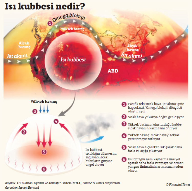 2021'de yılında yayımlanan bir araştırma, iklim değişikliğinin bu tür durgun yüksek basınç sistemlerini ve beraberinde getirdikleri aşırı sıcaklık ile kuraklığı destekleyen jet akımı davranışlarını teşvik ettiğini ortaya koydu. Jet akımı, hava sistemlerini batıdan doğuya taşıyan atmosferik bir hava akıntısı olarak biliniyor. Çalışmanın yazarlarından biri olan ve iklim bilimci Michael Mann, jet akımındaki bu değişimlerin, ısı kubbelerinin oluşumunda kilit rol oynadığını söylüyor.
