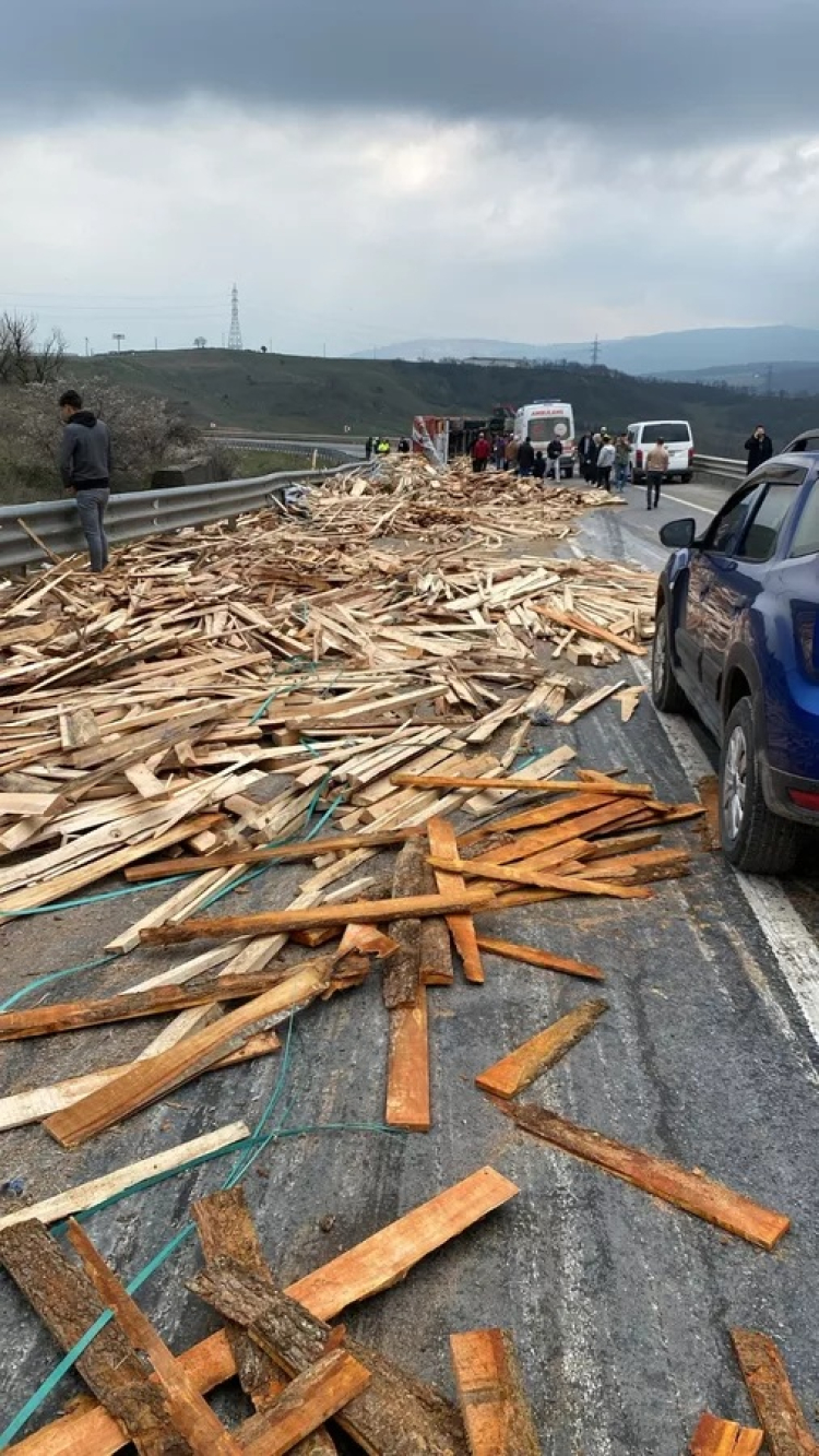 Kaza sonrası tırın üzerindeki keresteler yola saçılırken, yol trafiğe kapandı. Olay yerine ekipler sevk edildi, tırı ve yola saçılan keresteleri kaldırmak için çalışma başlatıldı.