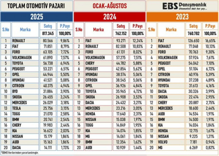 Bursada Bugün'ün köşe yazarı Emre Özpeynirci'nin paylaştığı bilgilere göre, Türkiye otomotiv pazarı 2025'in ilk 8 ayında 817 bin araca ulaştı. Listenin başında Bursa'da üretim faaliyetlerinde bulunan Renault ve Fiat damga vurdu.