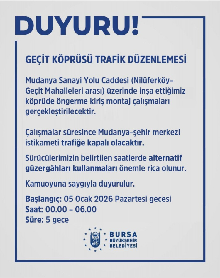 Montaj çalışmalarına 05 Ocak 2026 Pazartesi gecesi başlanacak olup, çalışmaların 5 gece sürmesi planlanmaktadır. Çalışmalar süresince, 00.00 - 06.00 saatleri arasında Mudanya-şehir merkezi istikametindeki yol trafiğe kapatılacaktır.