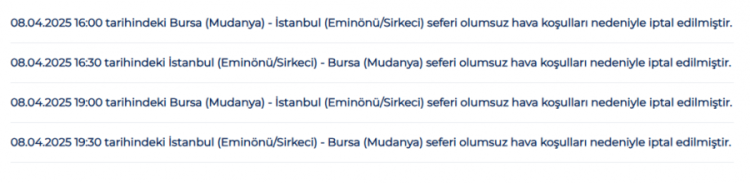 BUDO'dan yapılan duyuruya göre iptal olan seferler şöyle: