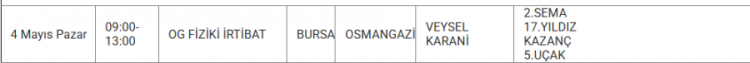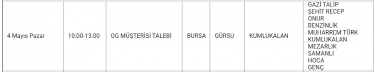UEDAŞ, Bursa'da 4 Mayıshangi mahallelerde planlı elektrik kesintisi yapılacağı duyurdu. Yapılan duyuruya göre, Gürsu, İnegöl, Karacabey, Kestel, Mustafakemalpaşa, Nilüfer, Orhangazi, Osmangazi İlçesinde elektrik kesintileri yapılacak. İşte 4 Mayıs elektrik kesinti haritası...