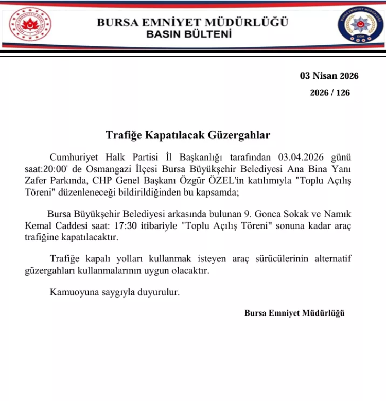 Bursa Emniyet Müdürlüğü tarafından yapılan açıklamaya göre, 3 Nisan 2026 Cuma günü CHP Genel Başkanı Özgür Özel'in katılımıyla düzenlenecek miting nedeniyle bazı yollar araç trafiğine kapatılacak.