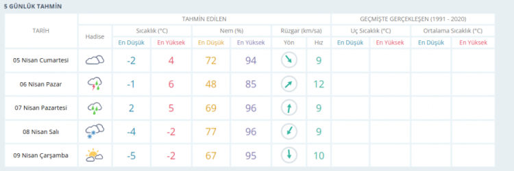 Öte yandan, Uludağ Kayak Merkezi'nde 7 Nisan Pazartesi akşamı hafif kar yağışı bekleniyor. 8 Nisan Salı günü yer yer kar yağışı, 9 Nisan Çarşamba günü ise bulutlu ve kar yağışlı bir hava tahmin ediliyor. Sıcaklıkların en yüksek -7°C, en düşük -13°C civarında olması öngörülüyor.