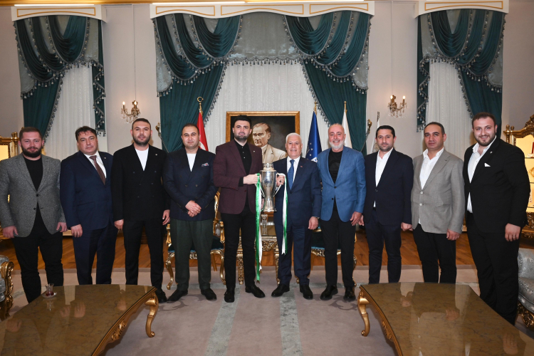 Nesine 3. Lig 1. Grup'ta şampiyonluğa ulaşarak 2. Lig'e yükselmeye hak kazanan Bursaspor’un Başkanı Enes Çelik ve yönetim kurulu üyeleri, şampiyonluk kupasıyla birlikte Bursa Büyükşehir Belediye Başkanı Mustafa Bozbey’i Tarihi Belediye Binası’nda ziyaret eti. Samimi bir ortamda gerçekleşen ziyarette, zorlu bir süreçten geçerek bir üst lige çıkmayı başaran Bursaspor’un yeni hedefleri konuşuldu.