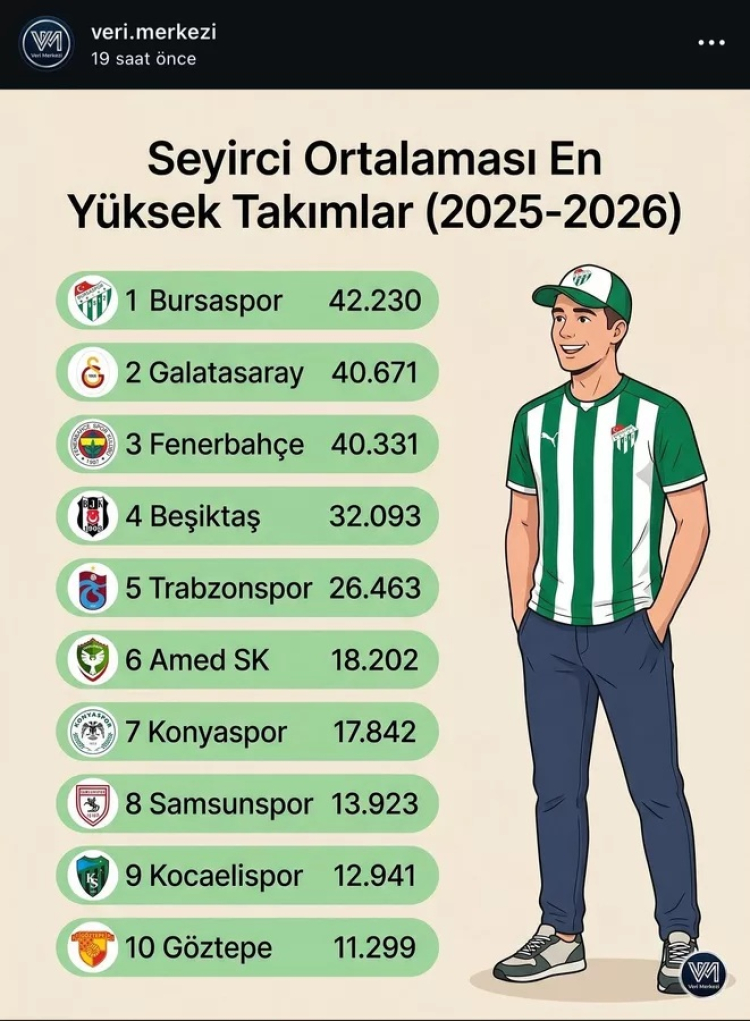 Verilere göre açıklanan listede 2025-2026 sezonunda yeşil-beyazlı ekip Bursaspor, 42 bin 230 ortalama ile Türkiye'de en çok taraftarı tribüne çeken takım oldu.