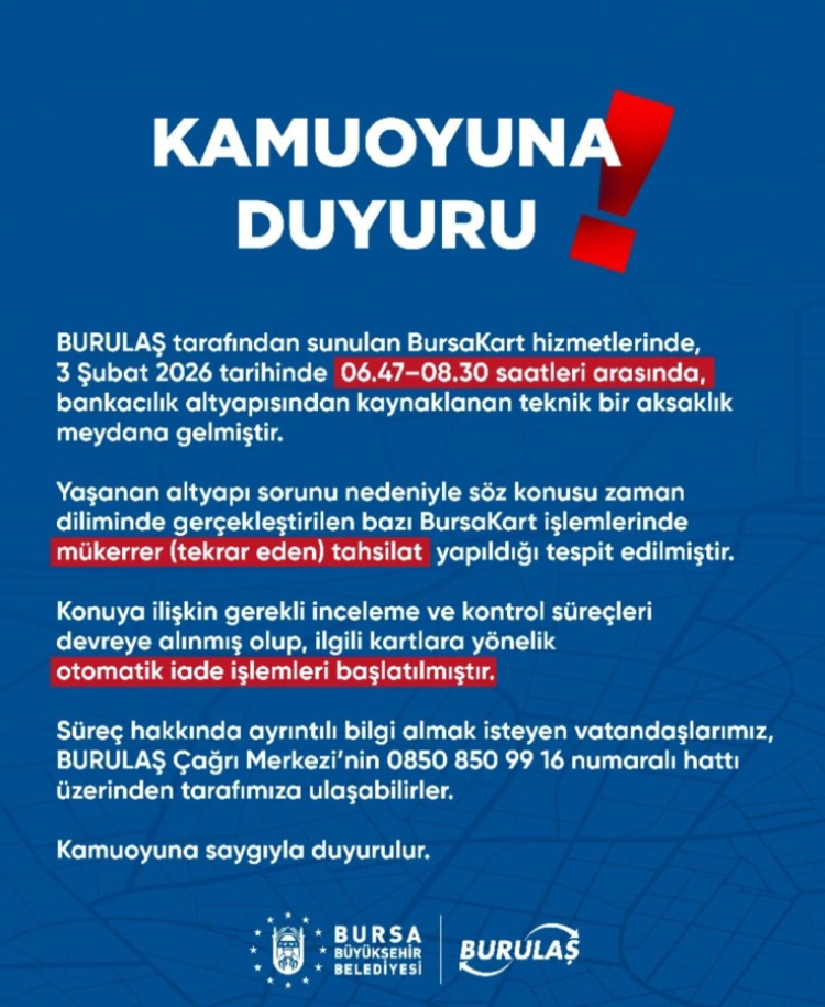 "BURULAŞ tarafından sunulan BursaKart hizmetlerinde, 3 Şubat 2026 tarihinde 06.47-08.30 saatleri arasında, bankacılık altyapısından kaynaklanan teknik bir aksaklık meydana gelmiştir.