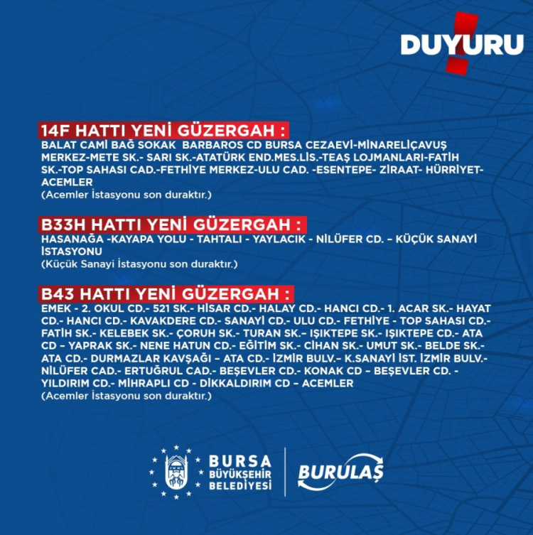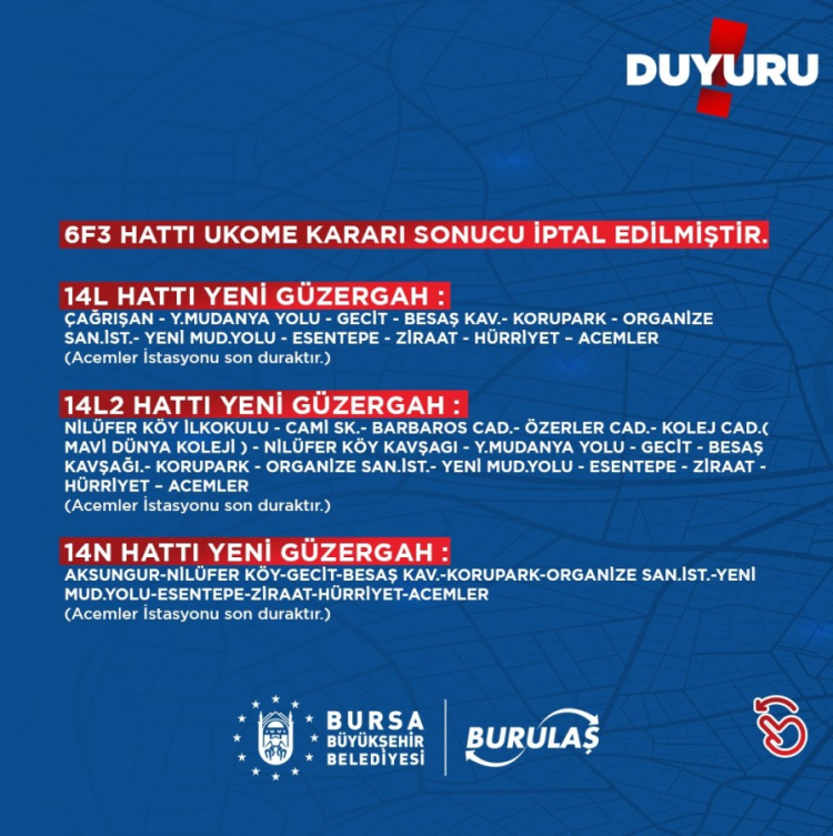 BURULAŞ'tan güzergah değişikliği açıklaması! 6F1, 6F2 14L, B43...