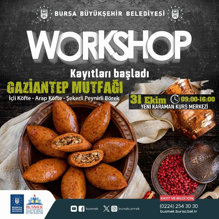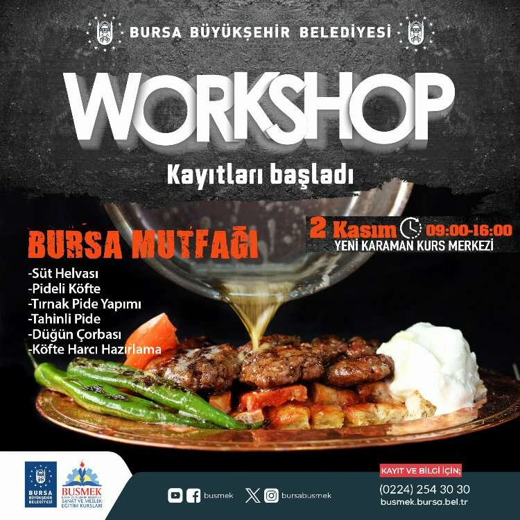 Bursa’nın sanat ve mesleki eğitim alanında en önemli markası olan BUSMEK, mutfaktaki yeteneklerini geliştirmek ve yeni lezzetler keşfetmek isteyenleri, aşçılık ve pastacılık atölyeleri ile buluşturuyor. Yenilenen mutfağıyla Yeni Karaman Kurs Merkezi’nde 30 Ekim – 5 Kasım arasında yapılacak atölye çalışmalarına kayıtlar başladı.