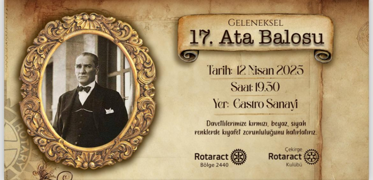 Çekirge Rotaract Kulübü’nün her yıl düzenlediği, “Geleneksel Ata Balosu”, bu yıl 12 Nisan 2025 Cumartesi günü saat 19.30’da gerçekleştirilecek etkinlik Nilüfer Organize Sanayi Bölgesi'nde (NOSAB) yer alan Gastro Sanayi’de yapılacak. Kulüp tarafından bu yıl 17’ncisi organize edilen gecede, Ulu Önder Gazi Mustafa Kemal Atatürk’ün anısı bir kez daha saygıyla yâd edilecek.