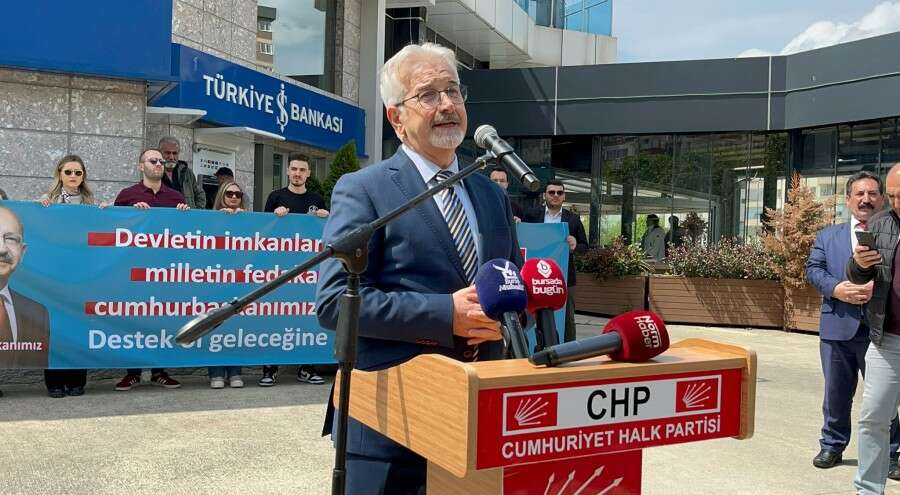 CHP Bursa Nilüfer İlçe Başkanlığı, FSM Bulvarında Atatürk'ün kurduğu banka önünde gerçekleştirilen bağış kampanyası etkinliği için basın açıklaması düzenliyor.