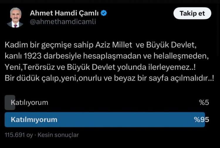 26. ve 27. Dönem AK Parti Milletvekili Ahmet Hamdi Çamlı, sosyal medya platformu X'te yazdığı Kadim bir geçmişe sahip aziz millet ve büyük devlet, kanlı 1923 darbesiyle hesaplaşmadan ve helalleşmeden, Yeni, terörsüz ve büyük devlet yolunda ilerleyemez..! Bir düdük çalıp, yeni, onurlu ve beyaz bir sayfa açılmalıdır..' sözleriyle gündem olmuştu. CHP Bursa İl Başkanlığı, Çamlı'nın sözleri üzerine Bursa Uluyol Adliyesi'ne gelerek suç duyurusunda bulundu.