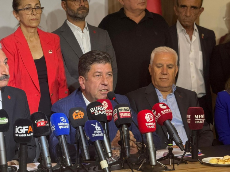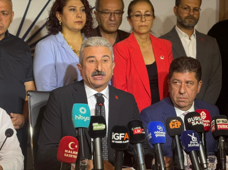 CHP Bursa İl Başkanlığı, CHP milletvekillerinin ve belediye başkanlarının katılımıyla Cumhurbaşkanlığı Aday Ofisi'nin Hükümet Programı çalışmalarına, partinin sürdürdüğü Parti Programı hazırlık sürecine dair CHP Bursa İl Başkanlık Binası'nda basın açıklaması gerçekleştiriyor.