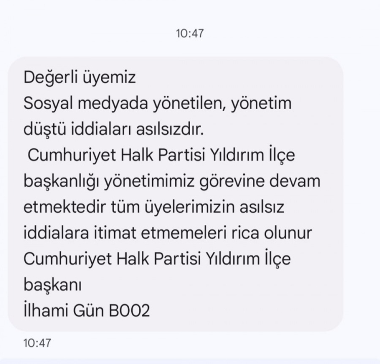 İl Başkanlığı'ndan edinilen bilgi bu şekildeyken, Yıldırım İlçe Başkanı İlhami Gün ise parti üyelerine yönetimin düştüğünün asılsız olduğunu belirten bir mesaj gönderdi.