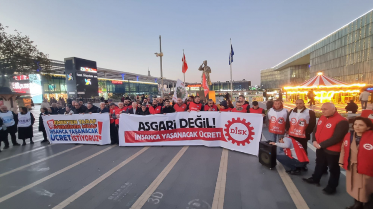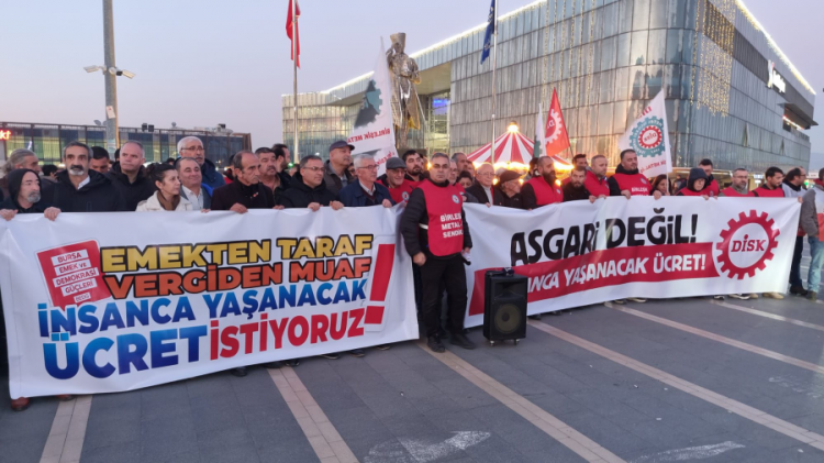 Devrimci İşçi Sendikaları Konfederasyonu (DİSK) Güney Marmara Bölge Şubesi, Şehreküstü Meydanı'nda asgari ücret ve vergilendirme sistemine dair taleplerini dile getirdi. Basın açıklamasını gerçekleştiren DİSK Güney Marmara Bölge Temsilcisi Birleşik Metal-İş Bursa Şube Başkanı Gökhan Aydın, "Hayat pahalılığı karşısında ücretlerimiz eriyor, alım gücümüz her gün daha da düşüyor" şeklinde konuşarak taleplerini dile getirdi.
