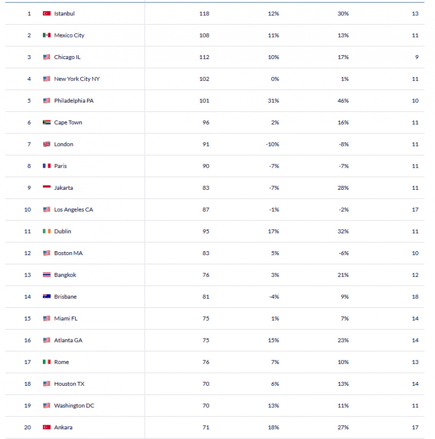 Rapora göre İstanbul dünyanın en yoğun trafiğine sahip kenti oldu. Rapora göre trafik gecikmeleri yüzde 12 oranında arttı. Listede İstanbul'un ardından Chicago geldi. Chicago'da sürücüler yılda ortalama 112 saatlerini trafikte kaybetti. Listenin üçüncü sırasında bulunan Mexico City'de bu süre 108 saat olarak ölçüldü.