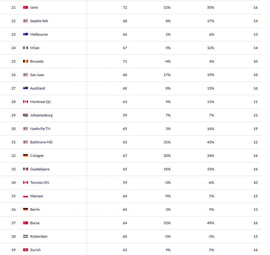 Listede İstanbul'un dışında Türkiye'den Ankara 20. sırada ve İzmir 21. sırada yer aldı. Ankaralılar yılda 71 saatini trafikte geçirirken İzmirliler 72 saatini trafikte geçiriyor.