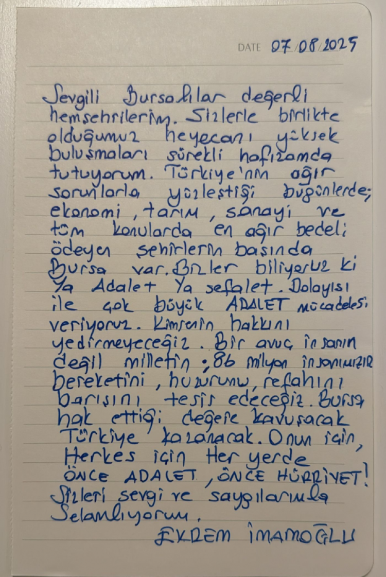 Ziyarette İmamoğlu'nun Bursalı yurttaşlara hitaben kaleme aldığı mektubunda, şu ifadeler yer aldı: