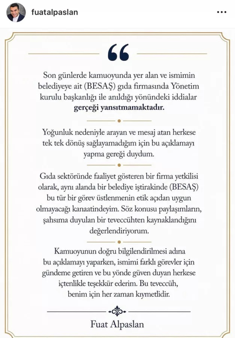 Bursa Büyükşehir Belediyesi'ne bağlı iştiraklerden BESAŞ hakkında son günlerde gündeme gelen haberlerle ilgili Fuat Alpaslan açıklama yaptı. Sosyal medya üzerinden paylaşımda bulunan Alpaslan, isminin BESAŞ Yönetim Kurulu Başkanlığı ile anılmasına ilişkin değerlendirmelerde bulundu.
