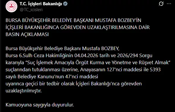 Anayasanın 127'nci maddesi ve 5393 sayılı Belediye Kanunu'nun 47'nci maddesi gereği, İçişleri Bakanlığı Başkan Bozbey'i geçici olarak görevden uzaklaştırdı. Söz konusu uygulamanın, hukuki süreç tamamlanana kadar geçici bir tedbir niteliğinde olduğu kaydedildi.