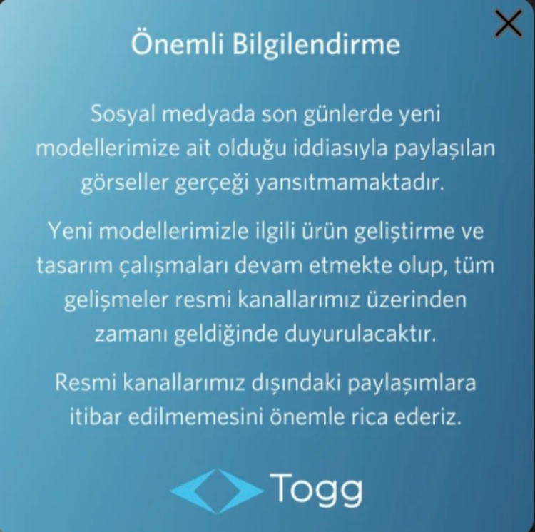 "Sosyal medyada son günlerde yeni modellerimize ait olduğu iddiasıyla paylaşılan görseller gerçeği yansıtmamaktadır. Yeni modellerimizle ilgili ürün geliştirme ve tasarım çalışmaları devam etmekte olup, tüm gelişmeler resmi kanallarımız üzerinden zamanı geldiğinde duyurulacaktır. Resmi kanallarımız dışındaki paylaşımlara itibar edilmemesini önemle rica ederiz."
