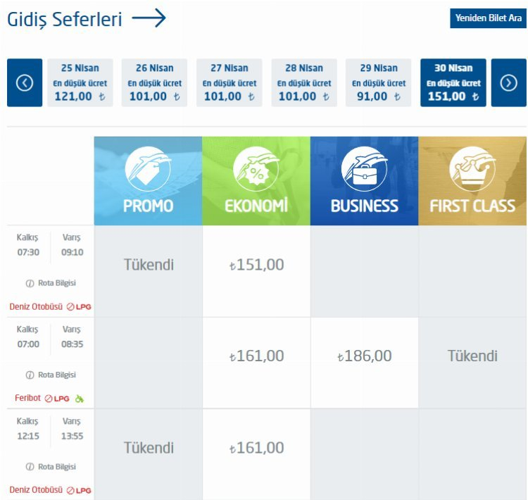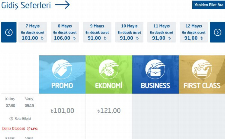 Deniz otobüsü ekonomi sınıfı biletler ise gelen zamla beraber 121 ile 161 TL arasında değişen fiyatlardan satışa sunuluyor.
