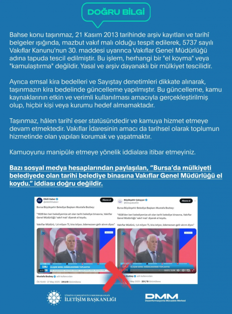 Cumhurbaşkanlığı İletişim Başkanlığı'na bağlı Dezenformasyonla Mücadele Merkezi (DMM), "Bursa'da mülkiyeti belediyede olan tarihi belediye binasına Vakıflar Genel Müdürlüğü el koydu." iddialarına yalanlama yaptı. İşte DMM'nin açıklamaları: