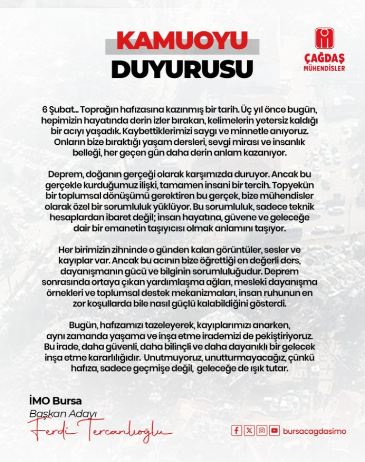İMO Bursa Başkan Adayı Ferdi Tercanlıoğlu, 6 Şubat depremlerinin üçüncü yıl dönümüne ilişkin bir mesaj yayımladı. Tercanlıoğlu yayımladığı kamuoyu duyurusuyla, deprem gerçeğini bir kez daha hatırlattı.