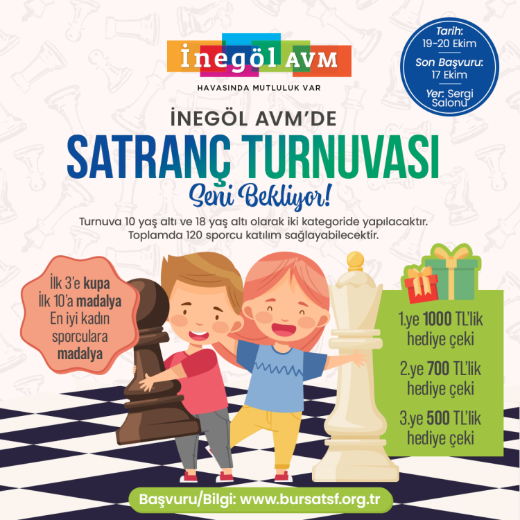 Strateji ve zekâ tutkunlarını bir araya getirecek Satranç Turnuvası, İnegöl AVM Sergi Salonu’nda gerçekleşecek. Turnuva, 10 yaş altı ve 18 yaş altı olmak üzere iki kategoride düzenlenecek ve genç satranç severlere kendilerini gösterme fırsatı sunacak. Başvurular www.bursatsf.org.tr üzerinden 17 Ekim 2024 tarihine kadar devam edecek.