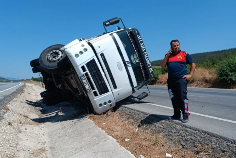 Bursa'nın İznik ilçesi ile Sakarya yolu üzerinde meydana gelen trafik kazasında kontrolden çıkan kamyon devrildi. Kazadan sürücü yara almadan kurtulurken, araçta maddi hasar meydana geldi.