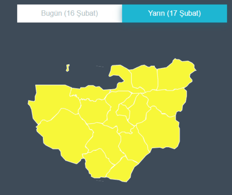 Meteoroloji Genel Müdürlüğü, Bursa'nın tüm ilçeleri için kuvvetli rüzgâr ve fırtına beklentisiyle "sarı kodlu" uyarı yaptı. Yarın (17 Şubat) etkili olması beklenen olumsuz hava koşullarına karşı Bursa Valiliği ve yetkililer, vatandaşların tedbirli olmasını istedi.