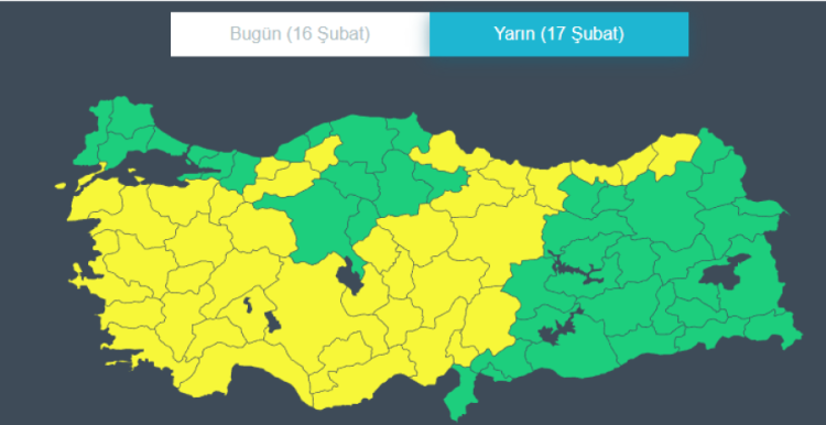Hava durumunun potansiyel tehlike oluşturabileceği anlamına gelir.Tahmin edilen meteorolojik olay (kuvvetli yağış, rüzgar, fırtına, kar vb.) olağan dışı değildir, ancak dikkatli olunması gerekir.Günlük yaşamı olumsuz etkileyebilecek durumlar oluşabilir.