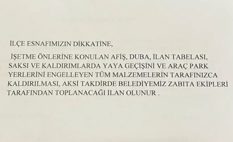 Zabıta Müdürlüğü, işletme sahiplerine ve vatandaşlara yapılan uyarılara rağmen, söz konusu malzemelerin kaldırılmaması durumunda ekipler tarafından toplanacağını duyurdu. Özellikle yayaların rahatça yürüyebilmesi için kaldırımların açık tutulmasının önemine dikkat çekildi.