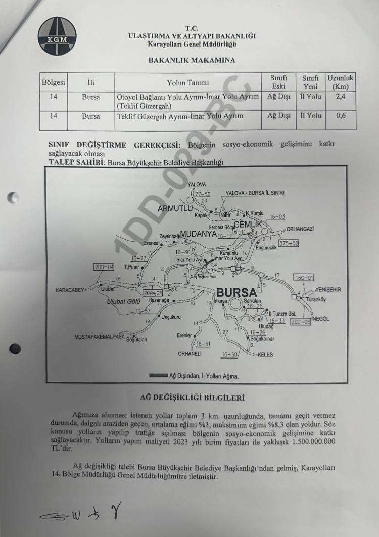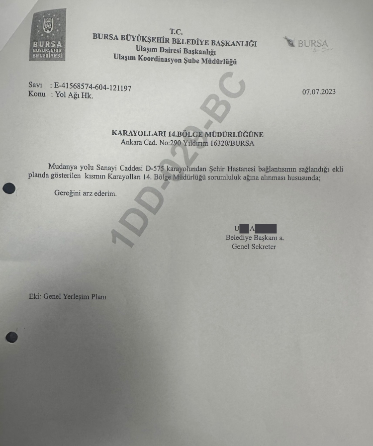 • 07.07.2023 tarihli ve 121197 sayılı yazı ile dönemin Belediye Başkanı tarafından yolun Karayolları ağına alınması resmi olarak talep edilmiştir.