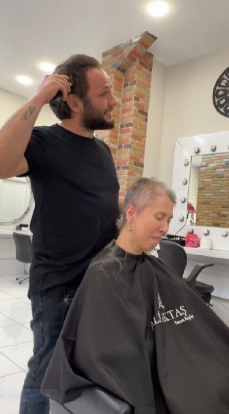 Kendi saçını da keserek arkadaşına destek olmak istediğini söyleyen Aktaş, "Biz normalde sosyal medya çekimleri yapıyoruz kuaförümüzde. Biz kendisine öncesi sonrası şeklinde hatıra kalması amacıyla bir video çekmek istedik. Sosyal medya ekibimizle konuştuk bu fikre kendisi de olur dedi. Saçını kesmeye başladığım anda duygusal bir an oluştu. İlk üzgün hali doğal olarak beni çok etkilemişti çünkü kendisi sevdiğim bir insan. O yaptığım saçları kesmek beni derinden etkiledi, ben de saçlarımı uzun zamandır uzatıyordum. Onun için değer diye düşündüm ve ona moral olsun, bu yolda yalnız değilsin demek için ben de başladım makineyle saçımı kazımaya. Saçımı kazıdığımda duygusal bir an oluştu kendisi de beklemiyordu. Kendisi 'yapma' dedi ama ben 'hayır yapacağım bu yolda beraberiz' dedim ve inatla kazımaya devam ettim. Sonrasında da çok duygusal anlar oldu sarıldık, ağladık. Sonrasında berbere gidip iyice temizlettim saçımı. Kendisini ağlayarak mecbur gönderdik" şeklinde konuştu.