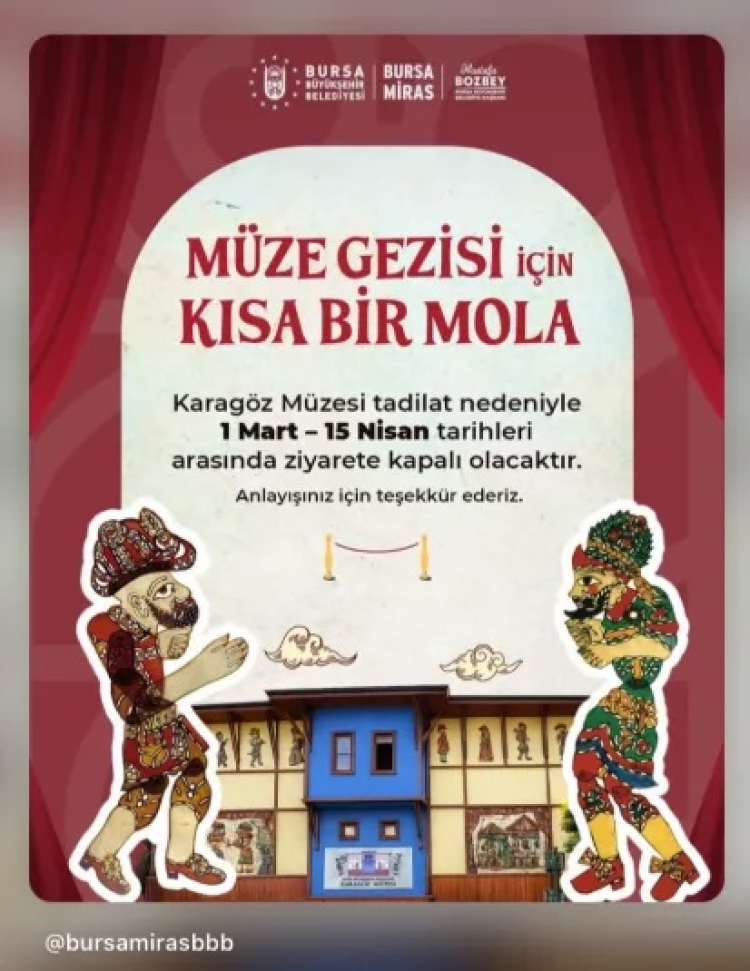 Bursa Büyükşehir Belediyesi tarafından yapılan açıklamada, müzenin 1 Mart - 15 Nisan tarihleri arasında kapalı olacağı bildirildi. Açıklamada, bakım ve yenileme çalışmaları kapsamında gerçekleştirilecek düzenlemelerle müzenin daha modern ve konforlu bir yapıya kavuşturulmasının hedeflendiği belirtildi.