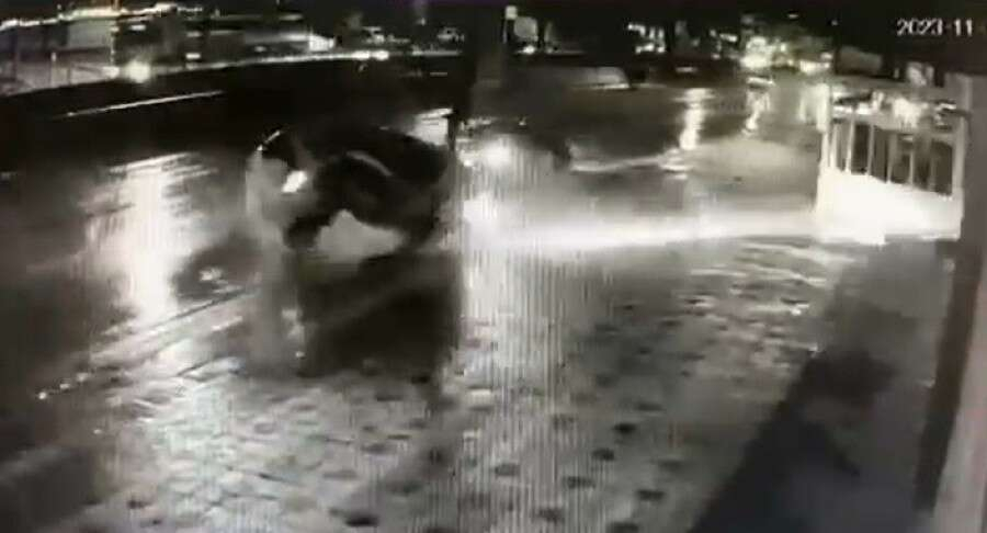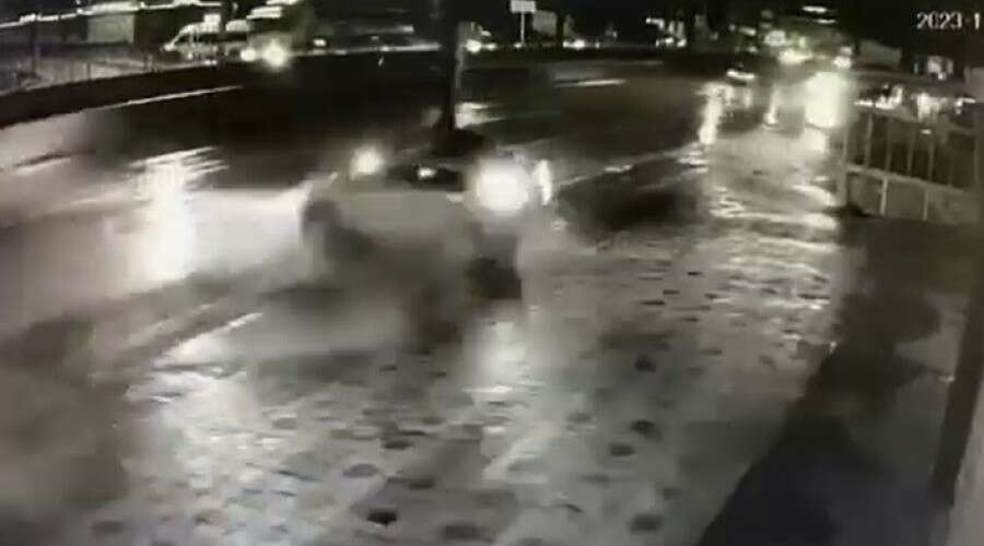 Bursa'da yağmurlu havada kayıp direğe çarpan otomobil sürücüsü, kapısından fırlayıp yola yuvarlandı. O anlar güvenlik kamerasına yansırken; yerde emekleyerek kenara kaçmayı başaran yaralı sürücü başka bir otomobilin altında kalmaktan şans eseri kurtuldu.