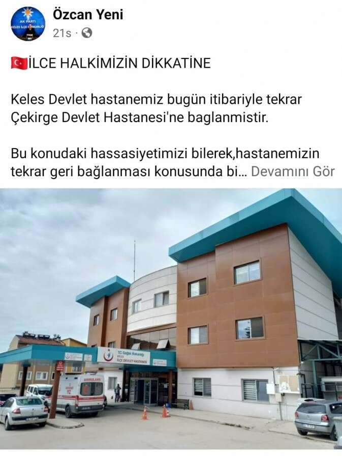 Konuyla ilgili çalışmaların başlattığını, ilçe halkının istek ve talepleri doğrultusunda hizmet ettiklerini belirten Keles AK Parti ilçe Başkanı Özcan Yeni, Keles Devlet Hastanesiyle ilgili müjdeli haberi verdi. Başkan Yeni, "Bu konudaki hassasiyetimizi bilerek,hastanemizin tekrar geri bağlanması konusunda bizlere destek olan Milletvekillerimize, İl Başkanımıza ve İl sağlık Müdürlüğümuze teşekkür ederiz" ifadelerini kullandı.