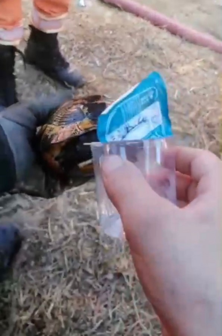 Bursa'nın Orhaneli ilçesinde dün çıkan yangında orman bölge gönülleri yangından kurtardıkları kaplumbağayı serinletip, su verdi. O anlar kameralara yansıdı.