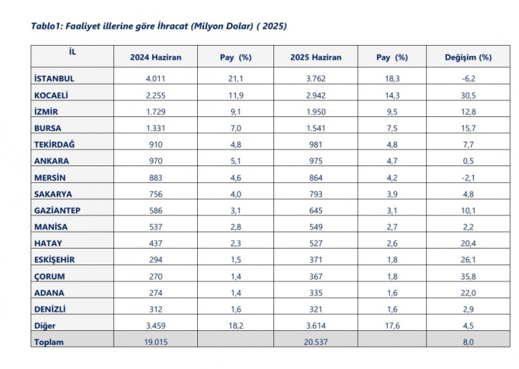 Ticaret Bakanlığı tarafından yapılan yazılı açıklamaya göre,faaliyet illeri bazında 2025 Haziran ayı ihracat rakamları belli oldu. Buna göre, Bursa 1 milyar 541 milyon dolarlık ihracatıyla Türkiye sıralamasında 4. sıraya yerleşti.